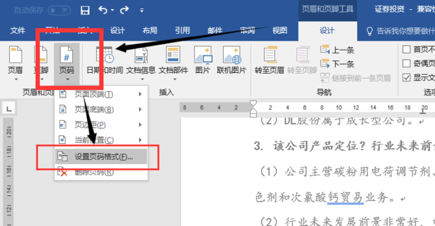 3、单击页眉和页脚工具设计----->页码----->设置页码格式;