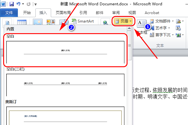 2、在插入窗口中点击”页眉“,然后选择想要的页眉格式,举例选择第一个”空白“;