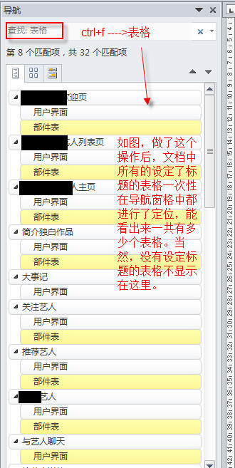 针对此回答,引来不少人的质疑和嘲笑,非常抱歉和遗憾;因为当时自己有个类似的需求,得知有该方法,遇到该问题时,当时觉得和自己当时遇到的问题一样就回答了。确实我说的这个方法只能是一次性突出显示word里的包含表格的标题,且该表格所属的标题必须做了级别设定,而且只是在导航窗格里黄色突出显示而已,好处是能看出来有级别设定的表格有多少,不是选中。如下图。