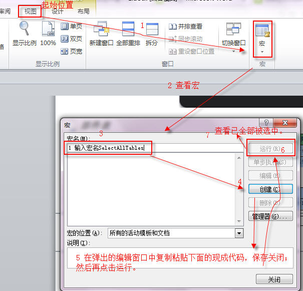 2 word---视图---宏----查看宏----输入宏名:SelectAllTables----点击创建(参图1)