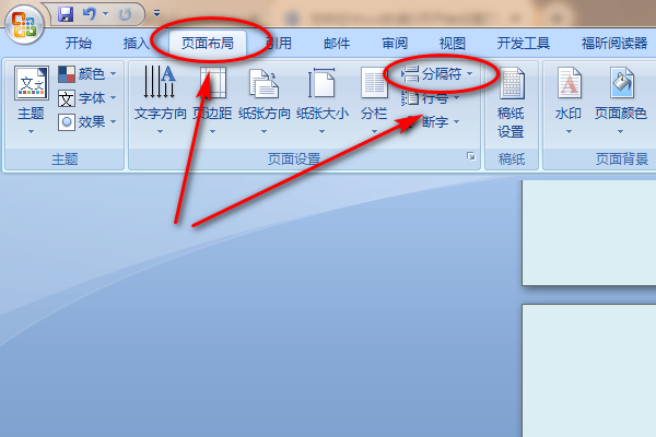 3、在word文档任务栏中选择页面布局,在页面布局界面选择分隔符选项,点击打开分隔符的下拉菜单。