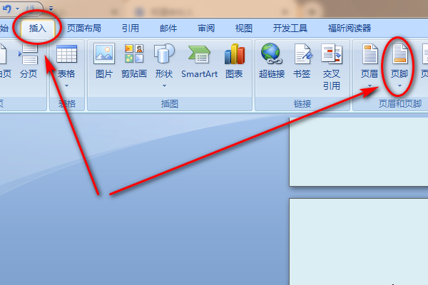5、设置好分隔符后,选择word任务栏中的插入选项,在插入界面选择页脚选项,点击进入页脚编辑界面。