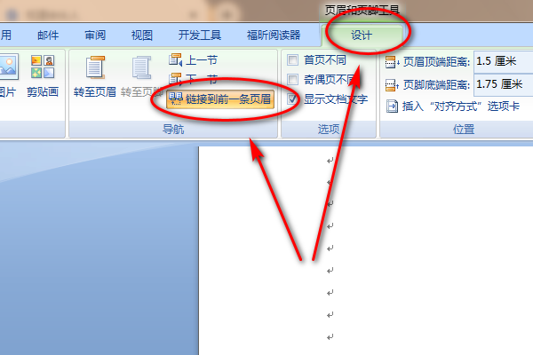 6、在页脚编辑界面选择任务栏中的设计选项,在设计界面把“链接到前一条页眉”关闭,即可完成只在word文档最后一页显示页脚的设置。