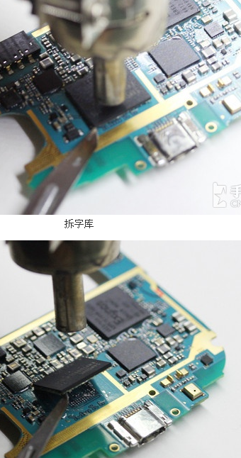 3、拆字库,在加热到一定程度后,用工具将字库芯片取下来。(高级工程师可操作,需要对温度、取字库的时间、力度有相当准确的掌握)