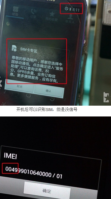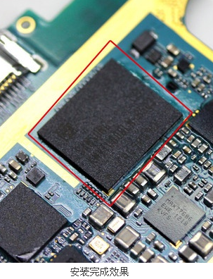 5、安装新字库,如同电脑的CPU一样,字库背面也有着类似针脚的锡点和对应的脚位,安装时需要找准方向和位置,反了的话是没办法用的,这个过程同样需要风枪加热进行操作(高级工程师可操作,需要对温度、时间、力度有相当准确的掌握)。新字库安装完成后,并不代表维修的完成,这时手机可以开机,也能读出SIM卡,但是顶部状态栏依旧没有信号,在拨号键盘输入*#06#出现的串号前四位为0049(工程模式串号),这时还需要修复信号、写入串号。