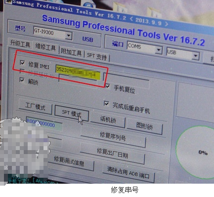 6、用SPT设备写入串号、修复信号。SPT模式和工厂模式是手机内置的两种不同的工程模式,SPT模式用于修复信号,工厂模式则用于写入串号。字库和CPU是加密的,换完原装全新字库后,主板上的CPU和新字库不匹配,就会出现没有基带串号的问题,这时需要用专业的SPT仪器去写入串号和修复信号。修复完成之后,再开机就可以看到信号和运营商的显示。(一般工程师可操作)