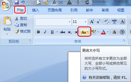 1、打开word,选中文档中需要改写的内容,在“开始”菜单“字体”设置框中,单击“Aa”。