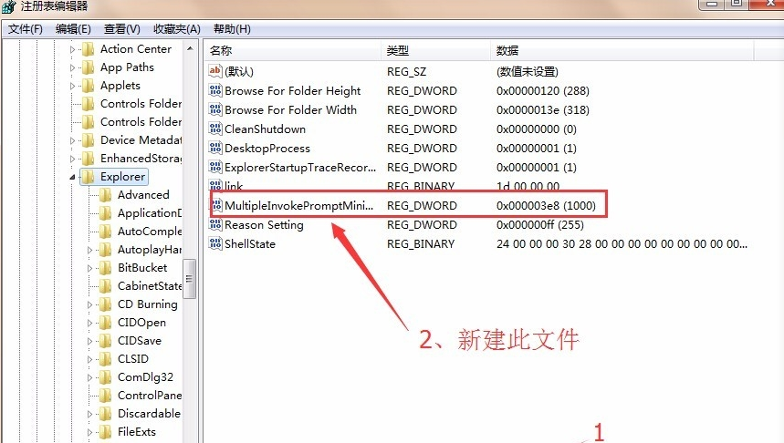 1、点击【开始】在【搜索程序和文件】中输入“regedit”打开注册表,然后展开到“HKEY_CURRENT_USER\Software\Microsoft\Windows\CurrentVersion\Explorer”下,在右键选择新建一个“DWORD32位”,重命名为“MultipleInvokePromptMinimum”,然后双击它,把它的值修改为你想要同时打开的文件数就可以了。