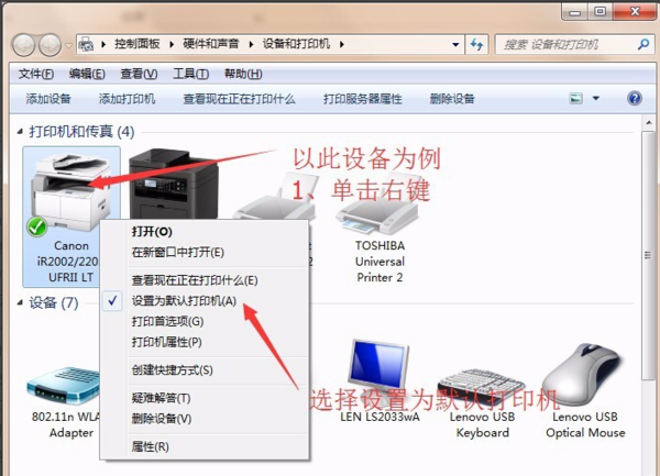 3、设置系统默认打印设备、在开始菜单右边点击【设备和打印机】,选择要批量打印文档的默认打印设备并设为默认打印机。