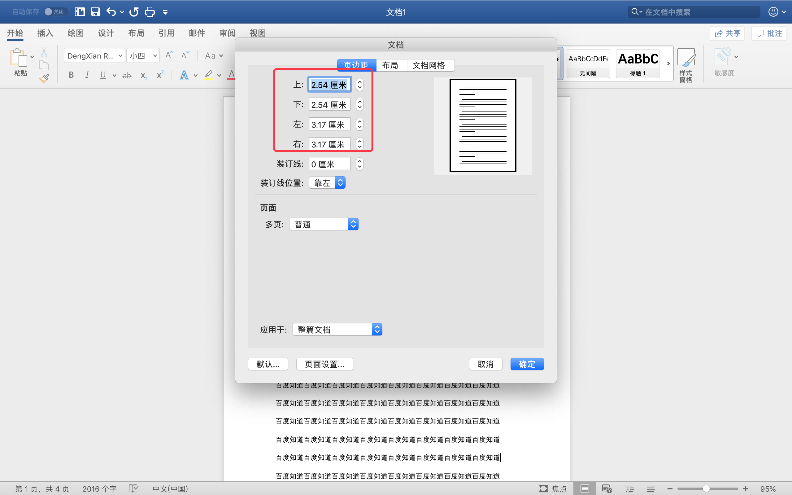 提示:若要更改默认页边距,请在选择新的页边距设置后单击“默认”。新的默认设置将保存在该文档
