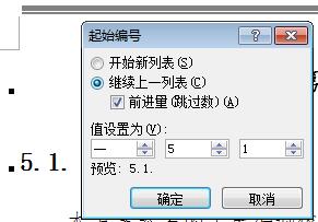 多级标题设置好后,选择标题号,右键属性设置编号值,选择继续上一列表,选择前进量,设置上一级标题起始编号值为5。见下图:
