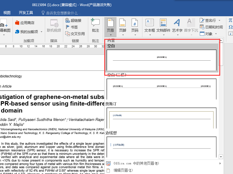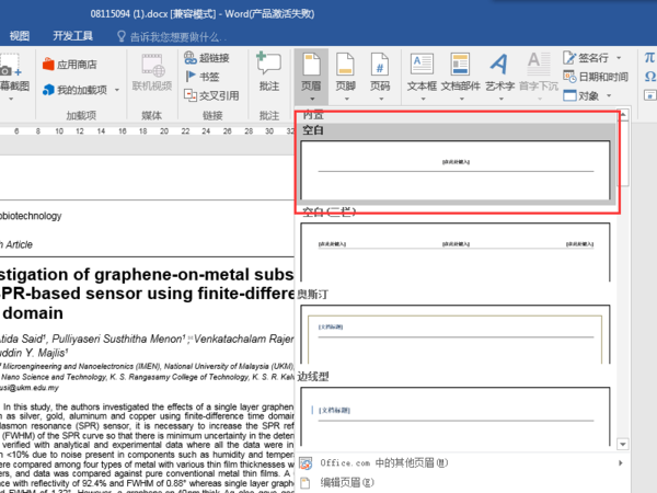 2.点击插入中的页眉(或页脚),选择“空白内容”,出现[在此处键入]。如下面图片所示内容;