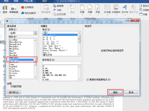 6.将光标放在共和页字之间,在插入命令中找到文本-文档部件。找到文档部件下面的域命令,在域名中找到numberpage命令,然后按确认。