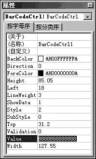 若要修改默认条形码的样式、条形码线条的宽度以及颜色等内容,我们可以右键点击插入的条形码,从弹出的菜单中依次选择“Microsoft Barcode Control 9.0对象→属性”命令,在接着出现的“属性设置”界面中进行相应的设置即可。