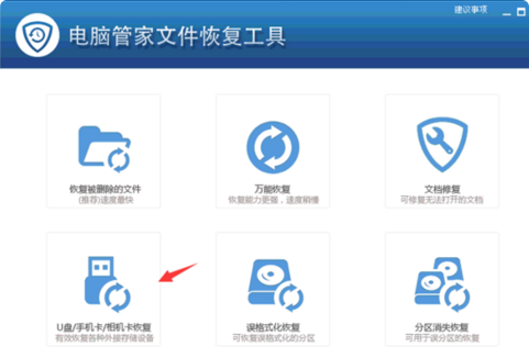 2、接下来我们将 U 盘连接电脑,然后运行这款软件,打开软件后,点击界面当中的“U盘相机卡恢复”选项,进行 U 盘格式化文件恢复操作。