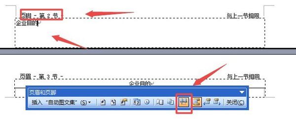 2、点击“视图——页眉和页脚”,将光标定位到第3页(即第2节)页脚的位置,在“页眉和页脚”工具栏中,点击“链接到前一个”按钮,使其退出高亮状态。