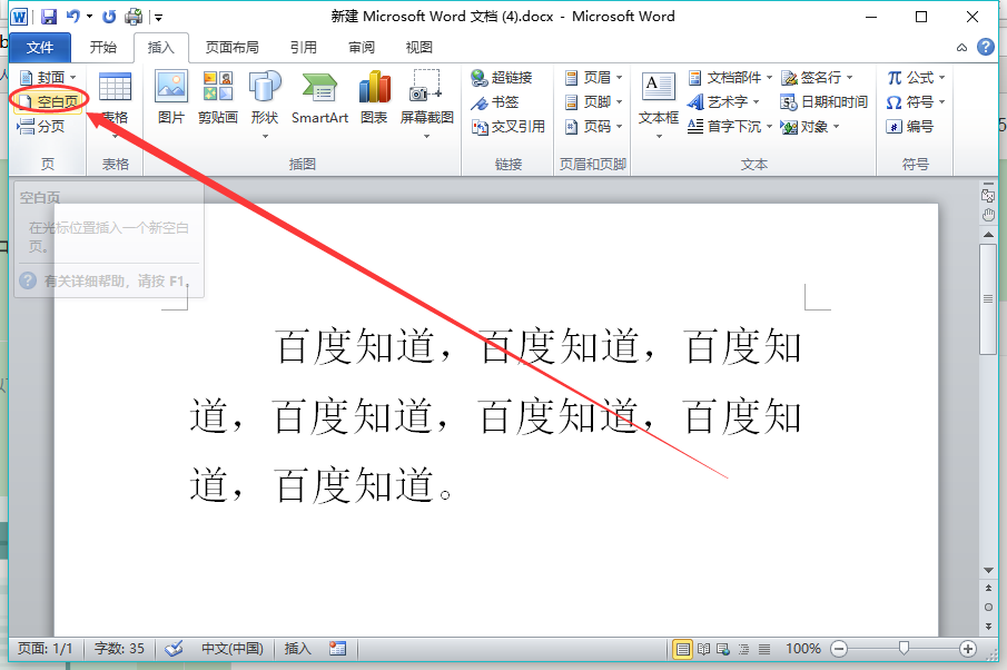 4.单击“插入”选项卡,在“页”组单击“空白页”按钮,在该页后面就插入了一页空白页。