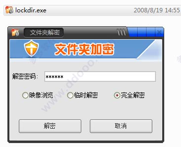 4、再次打开文件夹,里面只有“lockdir.exe”文件,双击输入密码解锁,建议用完全解密;
