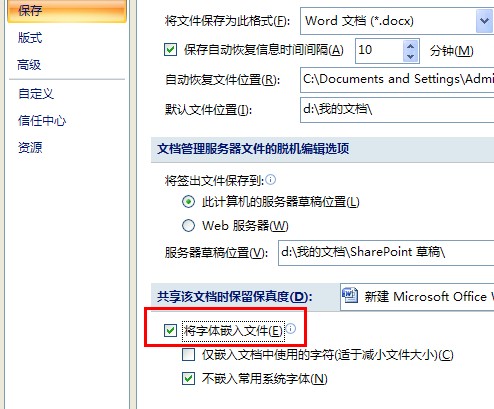 4、打开“Word选项”对话框的,在“共享该文档时保留保真度”区域选中“将字体嵌入文件”复选框。