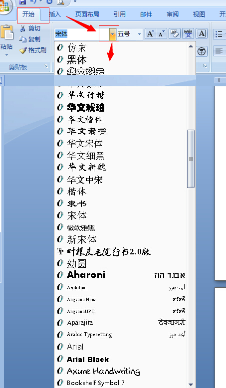 选中区域——开始——字体下拉——选择需要的字体,如图: