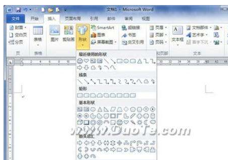 第3步:在Word2010“插入”功能区的“插图”分组中单击“形状”按钮,并在“线条”类型中选择合适的连接符,例如选择“箭头”和“肘形箭头连接符”。