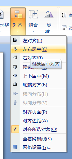 1. 按住Shift,同时选中左边一列的所有图形,单击窗口底部“绘图”工具栏上的“绘图”按钮,依次选择“对齐或分布→水平居中”命令,将所有选中的图形“水平居中”对齐。