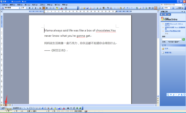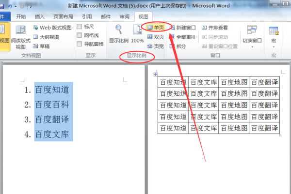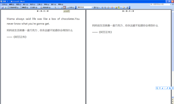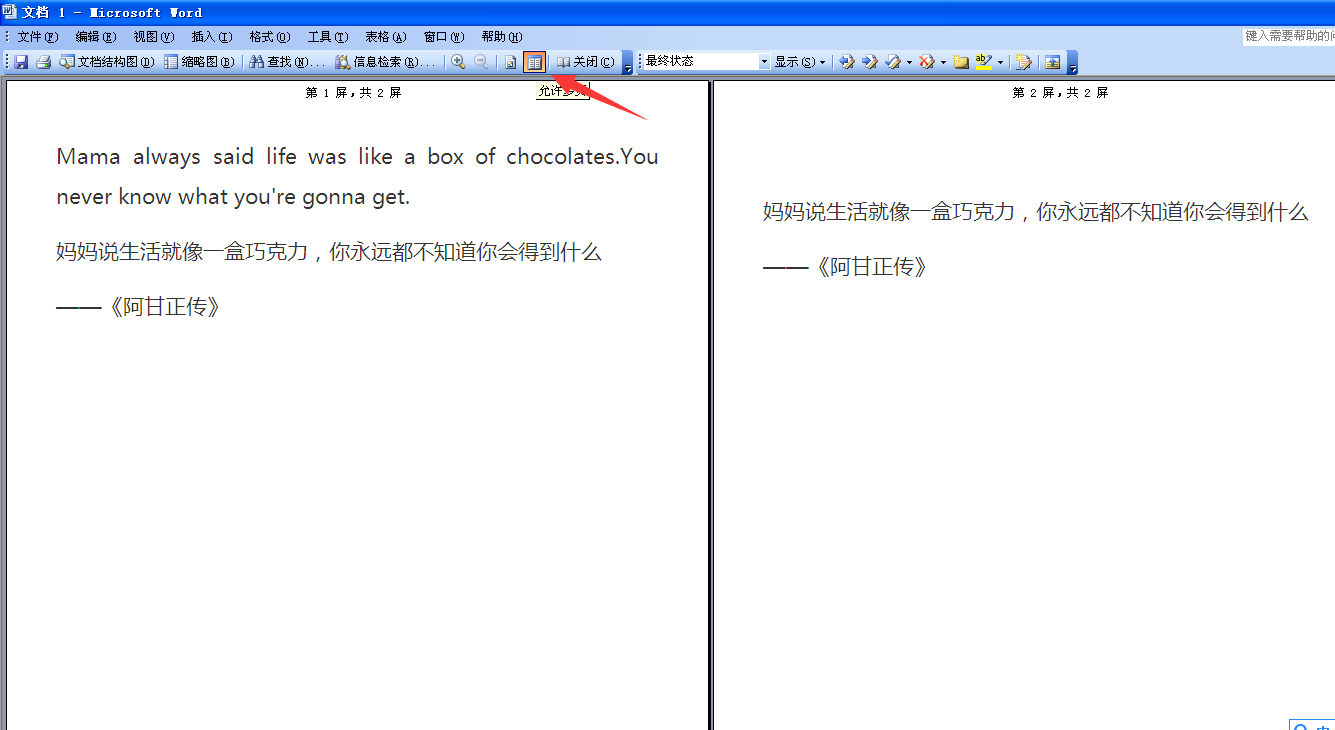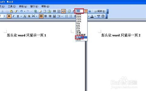 还有一种情况是左右拆分,即显示了双页(左边一页,右边一页),这种情况在2003版本中是在显示比例中设置的。取消的方法是:选择“显示比例”下拉中的整页,点击它即可只显示一页,再点击就会出现双页。