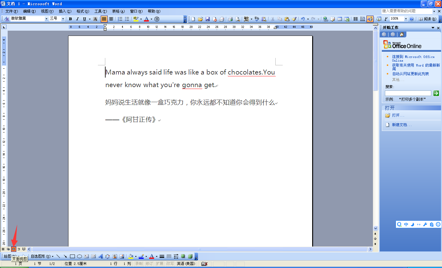 4、点击word屏幕下方的页面视图。效果如下图所示。