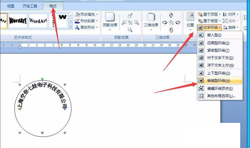 6、将圆形和艺术字文字环绕方式都设置为穿越型,而后按住alt键,调整艺术字的大小适合圆形。