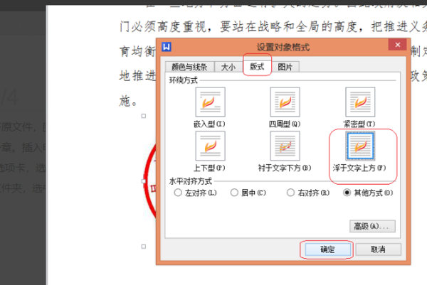选择“版式”选项卡,环绕方式选择“浮于文字上方”,水平对齐方式 选择“其他方式 "——”确定“。