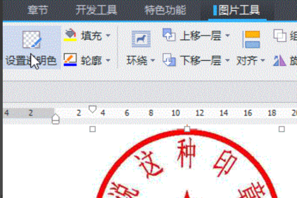 六、然后,在Word界面上方的菜单中找到“图片工具”,点击“设置透明度”将电子印章设置成透明。
