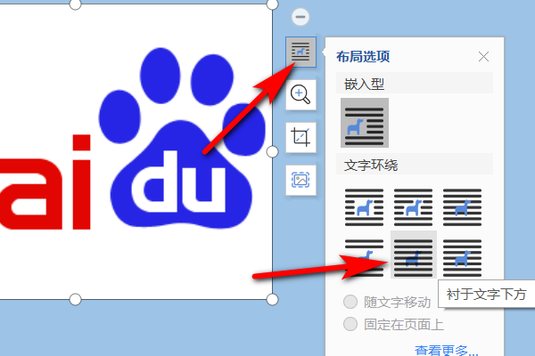 5、这样就可以将红色印章移动word文档里面,点击图片右侧的布局选项,选择衬于文字下方的嵌入方式即可。