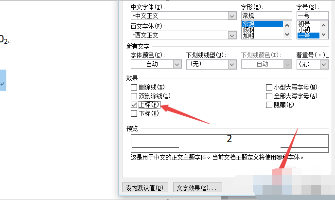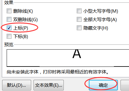 在打开的“字体”对话框中, 我们找到“字体”选项卡,在下边的“效果”栏中勾选“上标”复选框;在预览栏可以看到设置后的效果,设置好后我们点击确定按钮;