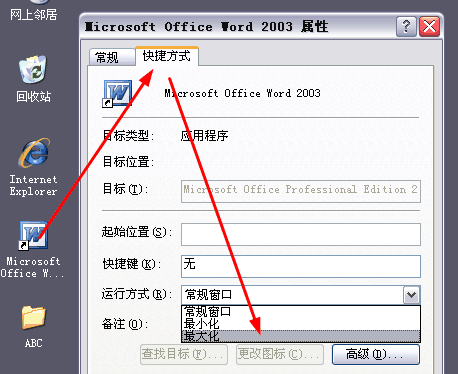 2.治本型.对Word的快捷方式点右键<属性>.在显示的窗口中有<运行>一项.有三种模式可选