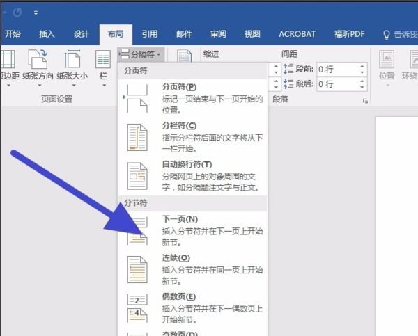 2、在布局中,我们找到分隔符,然后选择下一页。