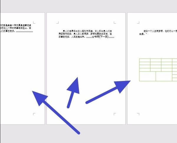3、在我们想要分页的段落后面,插入下一页的分隔符,可以看到页面被分成了三个页面。