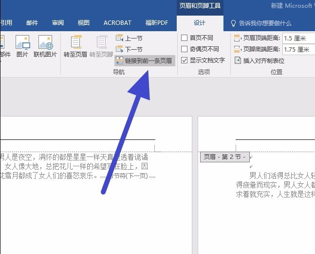 3、单击页眉和页脚---->链接到前一条页眉按钮,断开与前一节的联系;