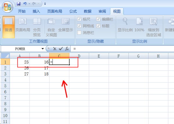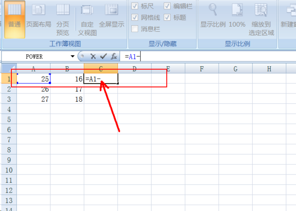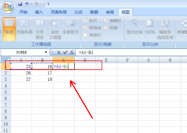 1、以下图的数据为例,依次计算减、乘、除法,先计算25-16:在C1单元格内输入【=】先不要按Enter。