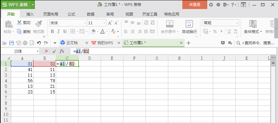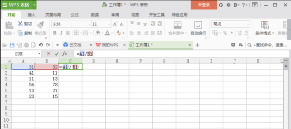 2、鼠标指在C1的位置,输入“=A1/B1”,(意思就是C1=A1除以B1的值),然后按下enter键。
