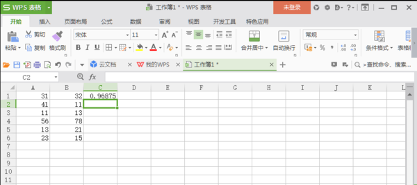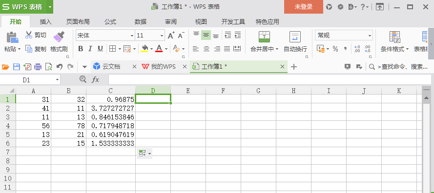 5、除法输入的公式为:【除数/被乘数】根据示例表格中的数据输入为【C3=A3/B3】
