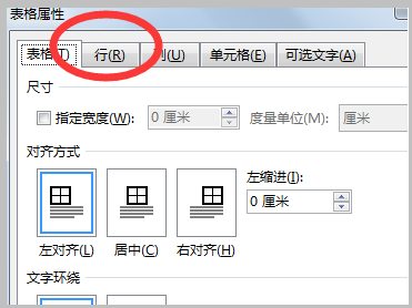3、点击后在打开的“表格属性”对话框选择“行”选项。