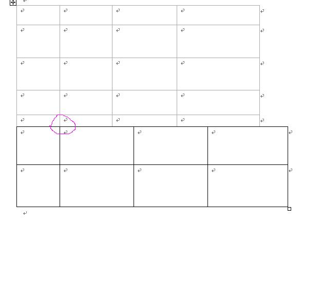 将两个表格合并的关键是:两个表格的文字环绕方式必须为“无”,然后将两个表格之间的段落标记删除,这样两个表格即可焊接在一起(即合并)。