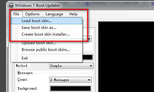 4、将语言更改为“english”后,点击“file”选项,扎到加载选项。选择完成后,需要将下载的.bs7格式文件导入到“load boot skin”里面去。