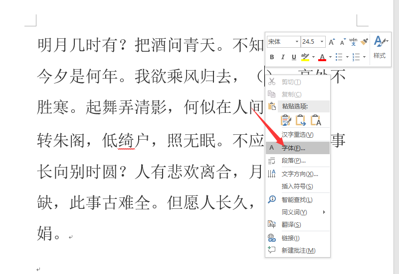 一、首先打开WORD文档。在需要插入下划线的地方用鼠标点击右键选择字体。