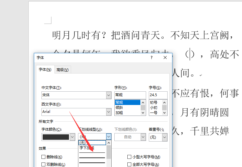 二、进入字体后,找到下划线类型,点击你需要的下划线线型。