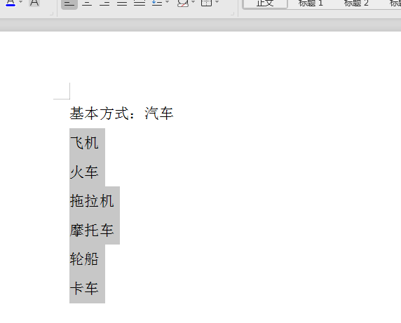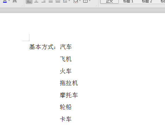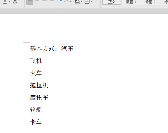 1、打开word程序,假设初始的文档模式如下,即从飞机至卡车均与首行首字对齐,现在需要将飞机至卡车部分与汽车对齐,即首行第6个字符对齐。