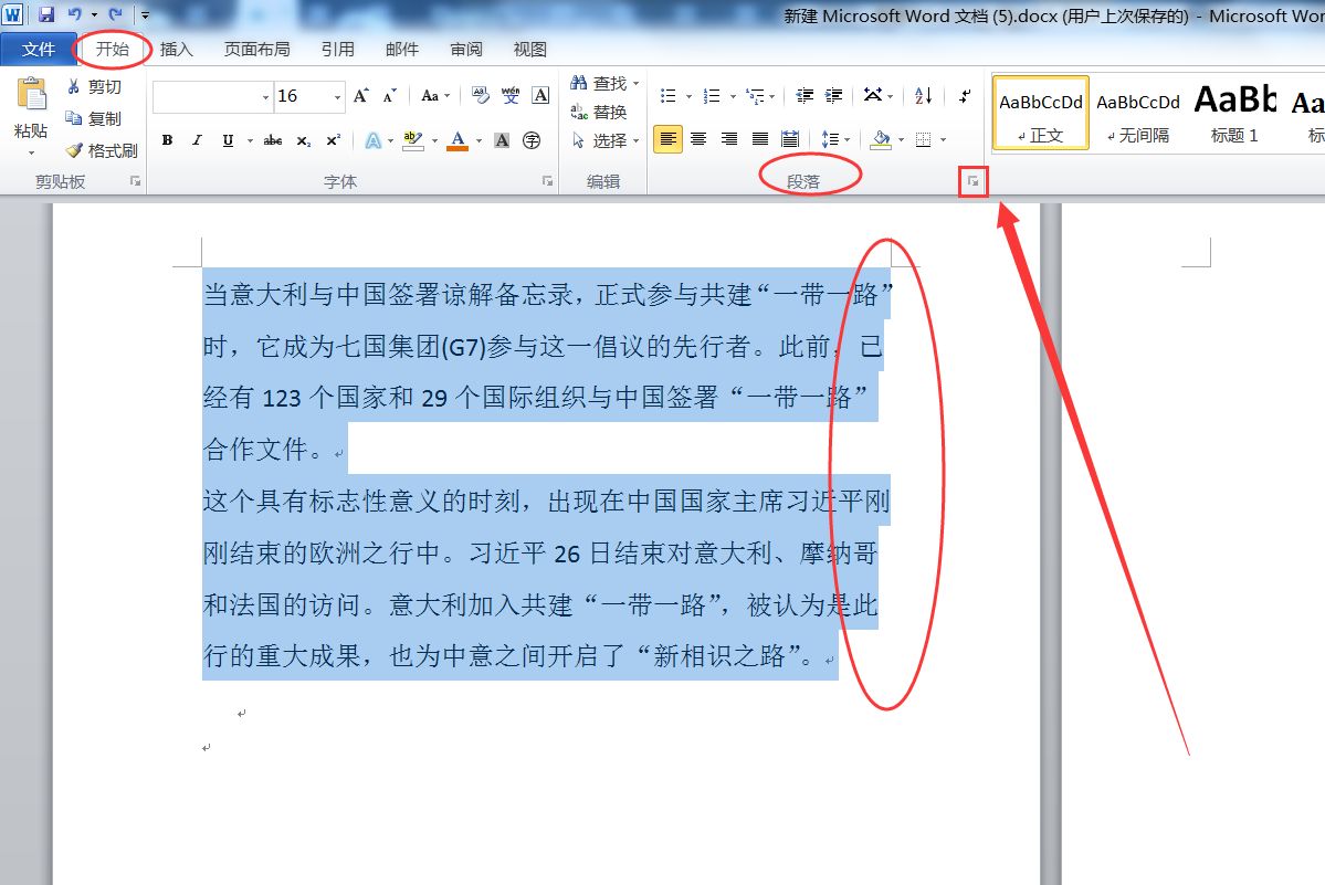 1、打开需要操作的WORD文档,选中相关段落文本,在开始选项卡中找到段落一项,点击右下角的展开按钮。