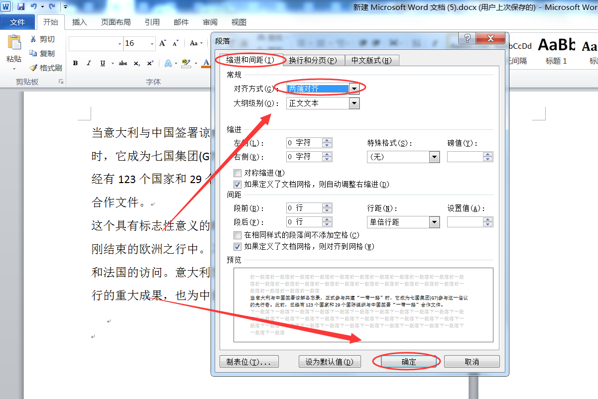 2、在“缩进和间距”标签页找到对齐方式,选择“两端对齐”,然后点击下面的确定按钮即可。