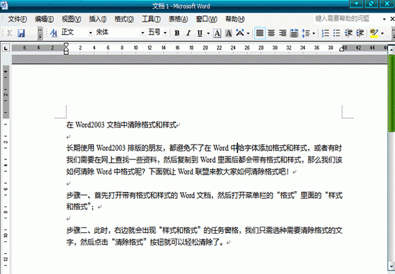 选中文档,在“格式”工具栏的左端单击“样式”(有两个A字)右边的下拉按钮,单击“清除格式”可以清除文档中原来设置的所有格式。