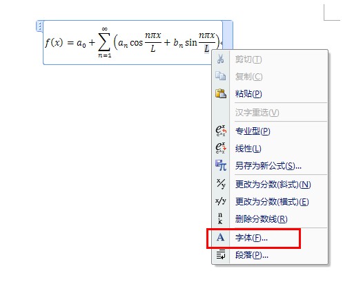 3、右击公式,选择字体,在弹出的对话框选择适合的西文字体,确定即可。